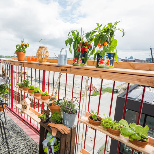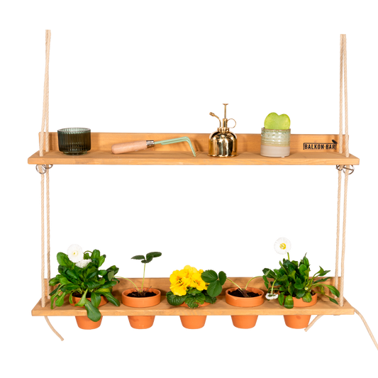 El imprescindible para todos los amantes de las plantas: ¡el jardín colgante Balkonbar Hanging Garden! El Balkonbar Hanging Garden se puede colocar en la parte inferior de tu Balkonbar, o en una pared y contiene 5 orificios redondos con un diámetro de 10 cm en los que puedes colocar macetas. Ideal para crear un mini huerto con plantas, hierbas y flores alegres.